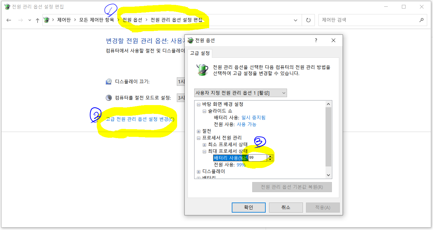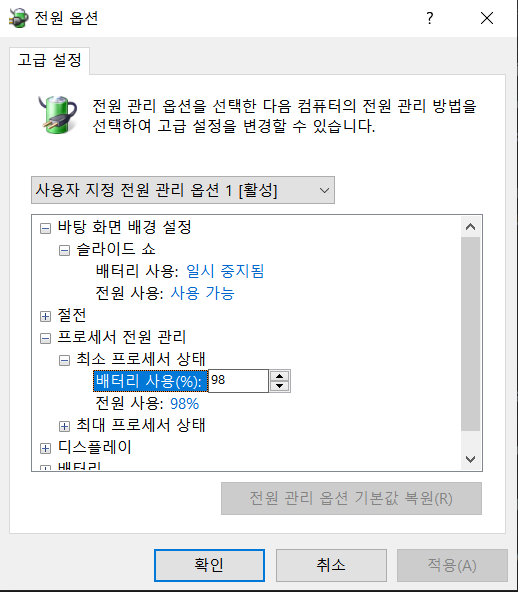 (1) 제어판 > 전원옵션 통해서, 최대/최소 프로세서 상태 99%로 고정하기