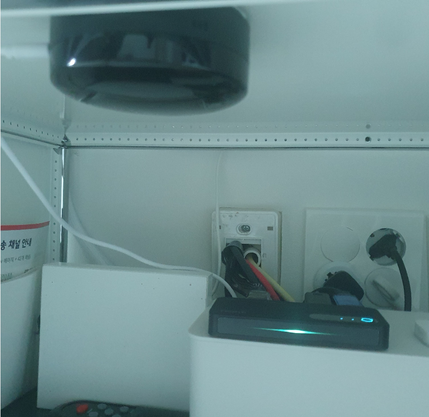 저는 아래와 같이, 양면 테이프를 이용해서 기기 수납장에 넣었습니다.