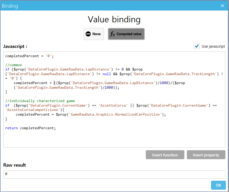 | completedPercent = '0'; //common if ($prop('DataCorePlugin.GameRawData.LapDistance') != 0 && $prop('DataCorePlugin.GameRawData.LapDistance') != null && $prop('DataCorePlugin.GameRawData.TrackLength') != '0') { completedPercent = (($prop('DataCorePlugin.GameRawData.LapDistance')/1000)/($prop('DataCorePlugin.GameRawData.TrackLength')/1000)); } //individually characterized game if ($prop('DataCorePlugin.CurrentGame') == 'AssettoCorsa' || $prop('DataCorePlugin.CurrentGame') == 'AssettoCorsaCompetizione'){ completedPercent = $prop('GameRawData.Graphics.NormalizedCarPosition'); } return completedPercent*100; |