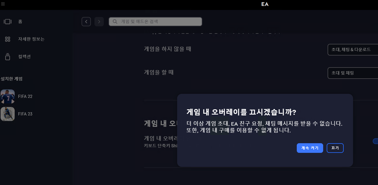 (6) EA Play 설정 (Steam에서 받아 설치 하신거라면, Steam에서도 오버레이 설정을 끄세요)